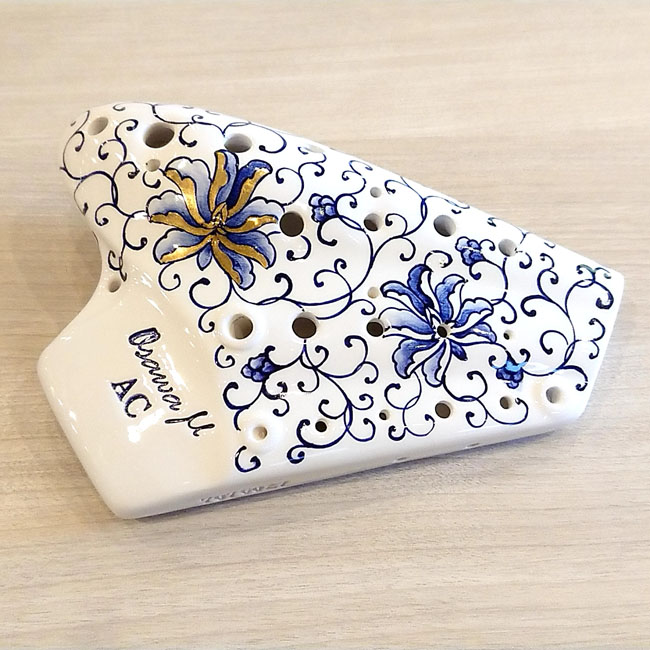 まず目を引くのは、世界的なオカリナ奏者・大沢聡氏がプロデュースする**『オオサワオカリナ』。なかでも磁器製に美しい唐草模様を施した『AC-T-A-μ(トリプレット)』は、楽器としての性能はもちろん、美術品としての価値も兼ね備えた憧れのモデルです。あわせてお持ちいただいた『AC-TN-μ(ナチュラル)』**も、三オクターブ近い音域を自在に操れる最高級μシリーズ。これほどの上位モデルが揃うのは、非常に稀なことです。