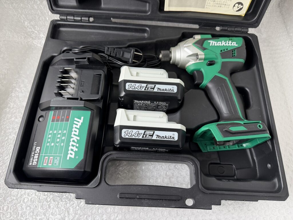 マキタの工具は非常に耐久性が高く、中古市場でも常に需要が尽きないアイテムです。今回お持ちいただいたお品物は、バッテリー2本と充電器、そして専用ケースが揃った完備品。大切に使われていたことが伝わる状態の良さを最大限に評価し、高価査定をさせていただきました。