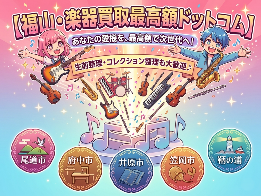 これまで大切にされてきた愛着のある楽器を、そのまま眠らせて価値を下げてしまうよりも、ぜひ次の奏者へ繋ぐお手伝いをさせてください。福山市内はもちろん、尾道市、府中市、井原市、笠岡市、鞆の浦など、近隣エリアの皆様からも多数お買取させていただいております。福山楽器買取は広島最高額ドットコム福山店へお任せください。