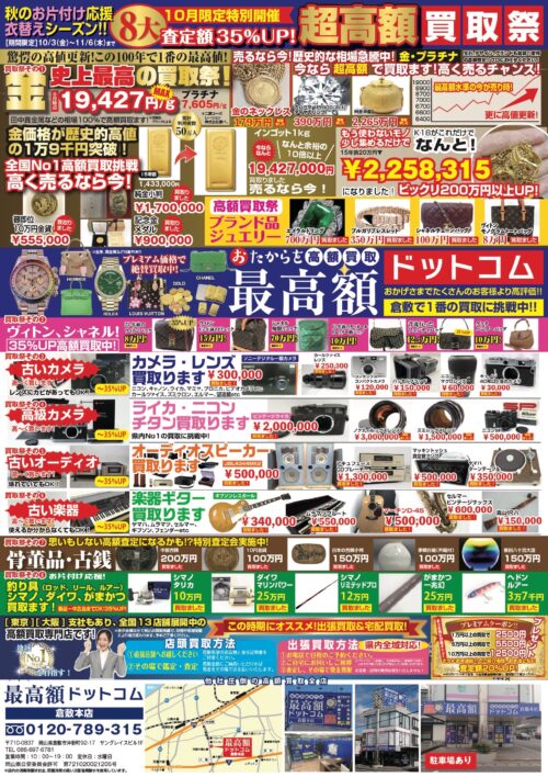 10月金相場が20000円突破し爆上がり中!!最高額ドットコム倉敷本店では国内最高額相場の買取実施中です。